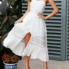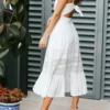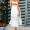 Women Sexy Dress, Sling Solid Color Deep V-Neck Floral Lace Back Straps Tie Dress, Summer Cutouts Ruffle Hem Backless Dress