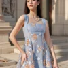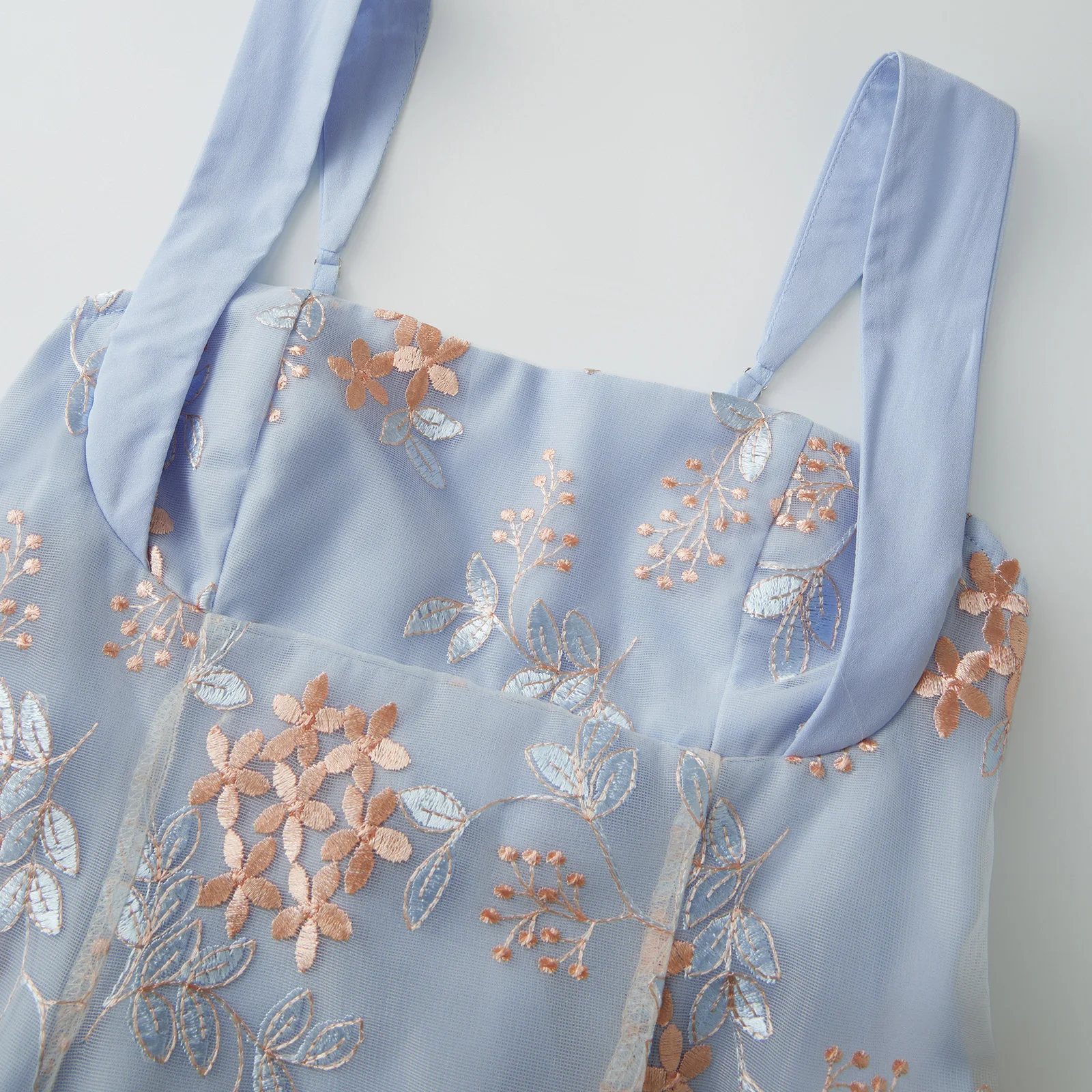 Women Sleeveless Mini Dress Summer Floral Embroidery Square Neck A Line Dress for Vacation Cocktail Streetwear