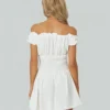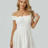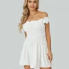Women Summer Short Dress, Solid Color Ruched Bust Boat Neck Off Shoulder Puff Sleeve A-Line for Ladies