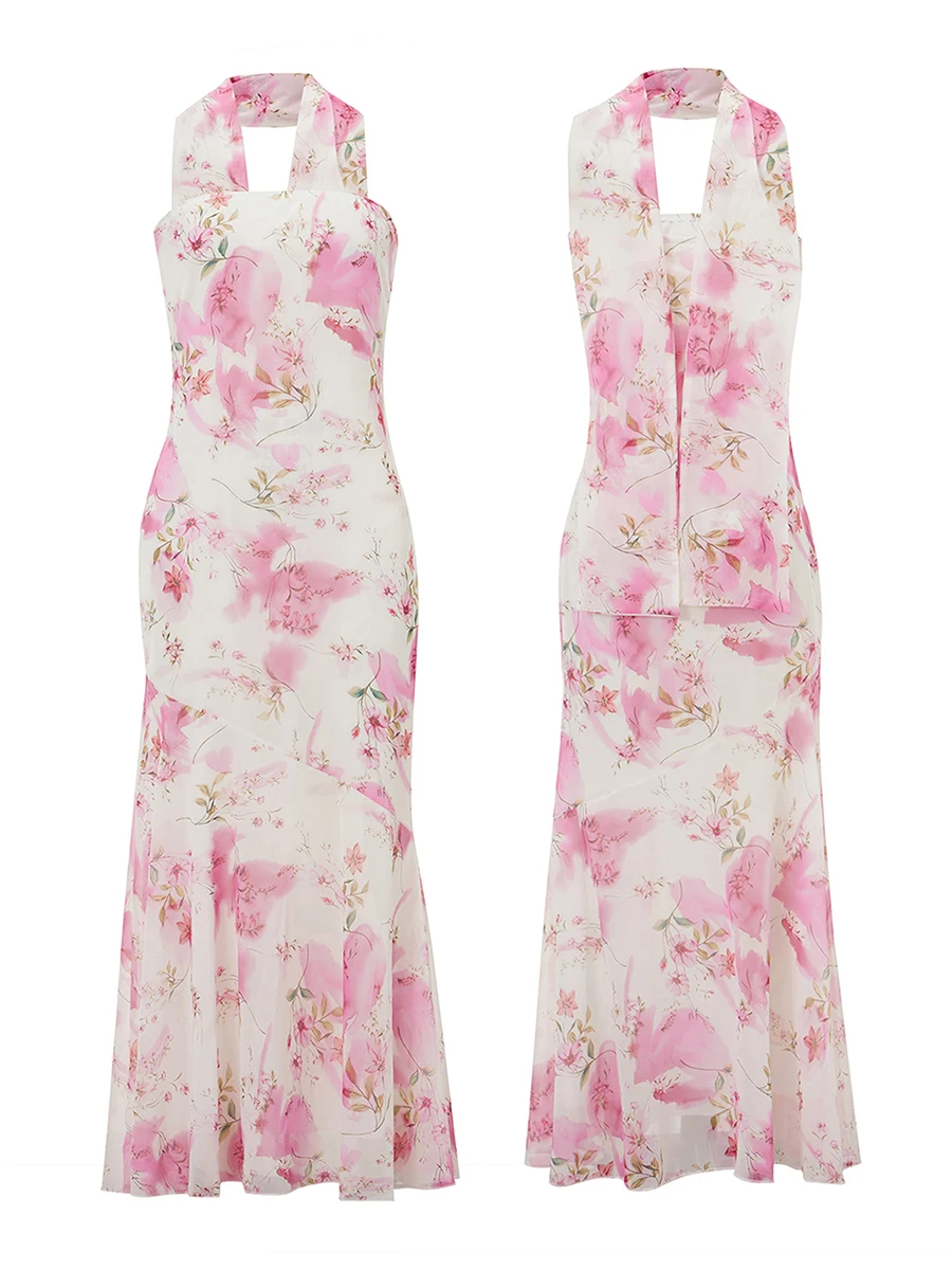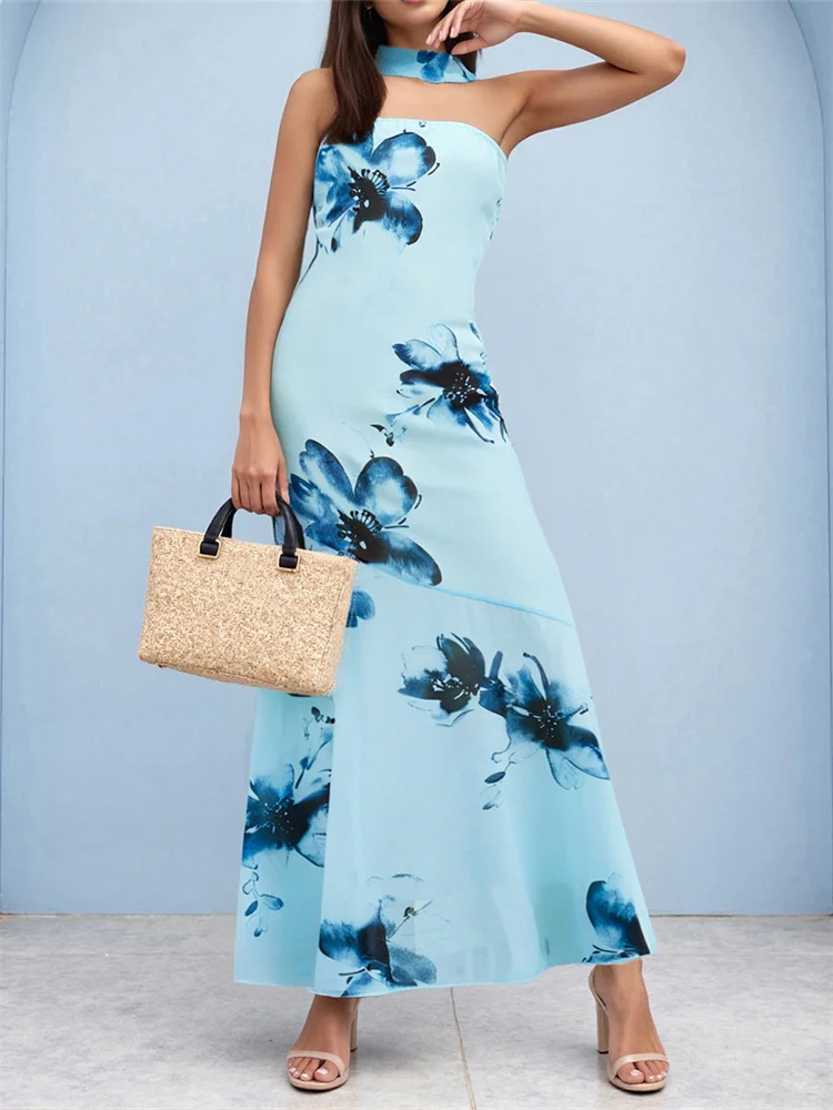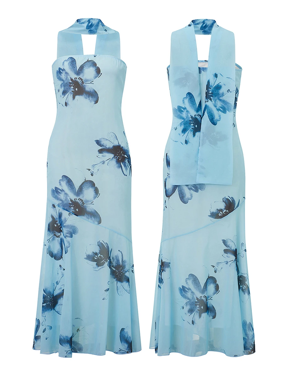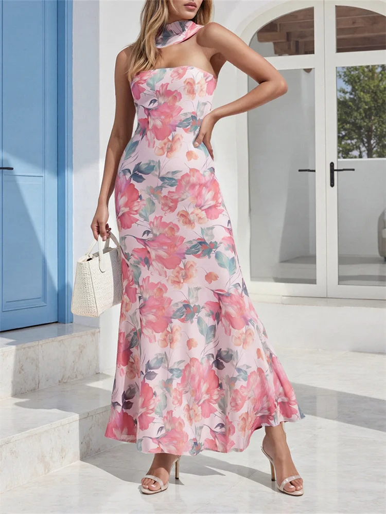 Women Long Tube Top Dress Slim Flower/Solid Off Shoulder Sleeveless Fishtail Bodycon Dress with Scarf