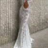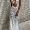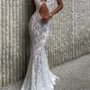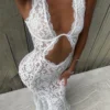 Women’s Lace Halter Dress Stylish Solid Mesh Lace Floral See Through Sleeveless Slim Fit Long Bodycon Fishtail Dress