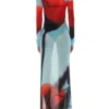 Womens Boydcon Long Dress Sheer Mesh Long Sleeve Boat Neck Floral Print Midi Dress Side Split Dress